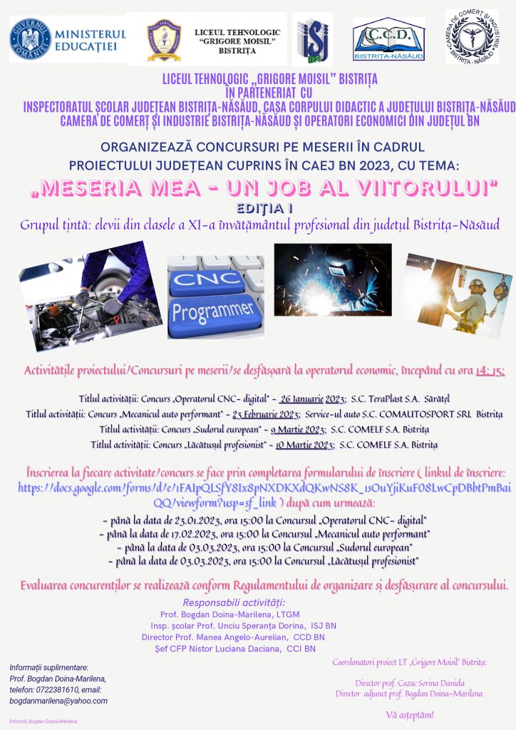 FESTIVITATEA DE PREMIERE - CONCURSURI PE MESERII- PROIECTUL JUDEȚEAN „MESERIA MEA-UN JOB A VIITORULUI”, CAEJ BN 2023 "