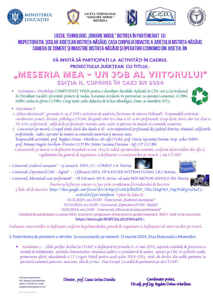 FESTIVITATEA DE PREMIERE - CONCURSURI PE MESERII- PROIECTUL JUDEȚEAN „MESERIA MEA-UN JOB AL VIITORULUI”, CAEJ BN 2024, Ediția a II-a