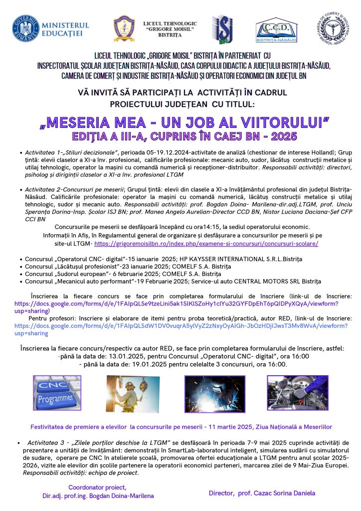Liceul Tehnologic Grigore Moisil Bistrița, în perioada 7 - 9 mai 2025, desfășoară ultima activitate din proiectul Meseria mea-un job al viitorului, cu titlul: „Zilele porților deschise la LTGM”, în care așteptăm vizita elevilor de clasa a VIII-a, din județ.